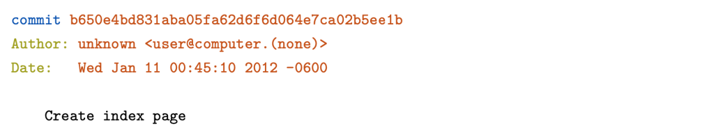 Next, Git displays the author of the commit. But since we haven’t told Git our name yet, it just displays unknown with a generated username. Git also outputs the date, time, and timezone (-0600) of when the commit took place. Finally, we see the commit message that was entered in the previous step.