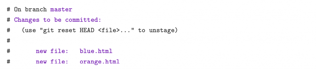 Try running git log. It only outputs the first commit, which tells us that blue.html and orange.html have not yet been added to the repository’s history. Remember, we can see staged changes with git status, but not with git log. The latter is used only for committed changes.