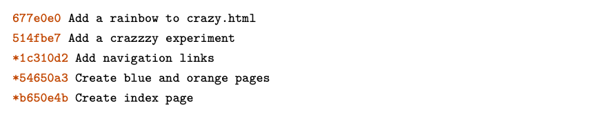 Let’s add one more snapshot to the crazy branch. Rename crazy.html to rainbow.html, then use the following Git commands to update the repository.
