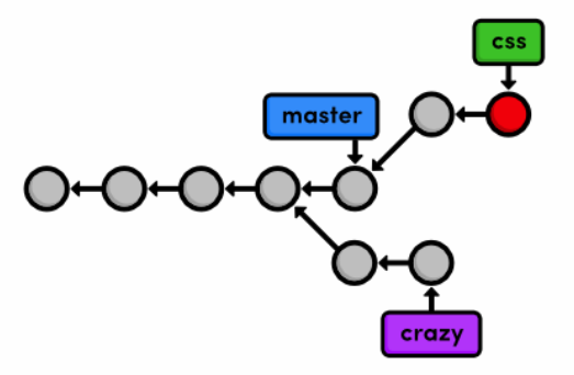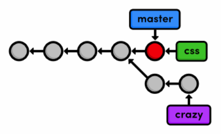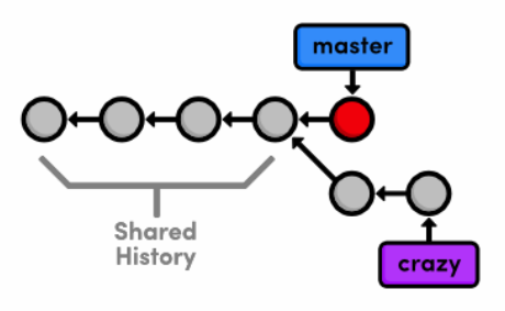 After this addition, our complete repository history looks like the following. Remember that the crazy branch doesn’t include any commits in master after the fork.