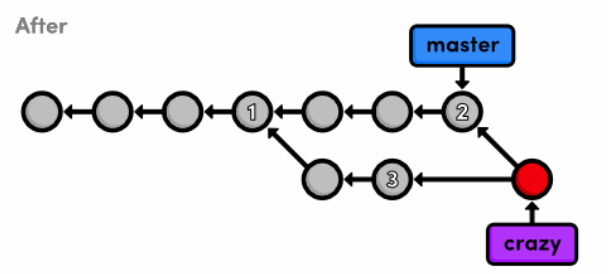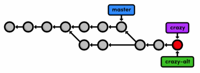 A 3-way merge occurs when you try to merge two branches whose history has diverged. It creates an extra merge commit to function as a link between the two branches. As a result, it has two parent commits. The above figure visualizes this with two arrows originating from the tip of crazy. It’s like saying “this commit comes from both the crazy branch and from master.” After the merge, the crazy branch has access to both its history and master history.