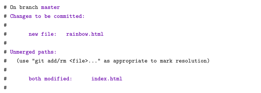 This is our first merge conflict. Conflicts occur when we try to merge branches that have edited the same content. Git doesn’t know how to combine the two changes, so it stops to ask us what to do. We can see exactly what went wrong with the familiar git status command: