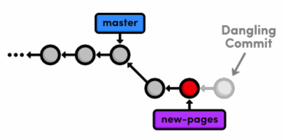 The commit that we removed from the branch is now a dangling commit. Dangling commits are those that cannot be reached from any branch and are thus in danger of being lost forever.