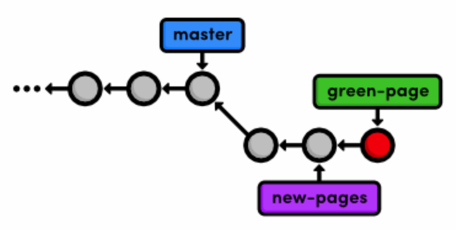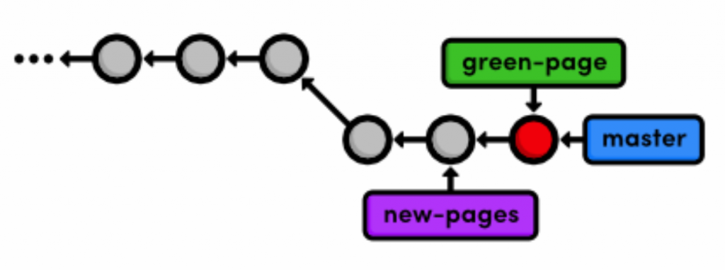 The above diagram makes it easy to see that the green-page branch is an extension of new-pages, but how would we figure this out if we weren’t drawing out the state of our repository every step of the way?