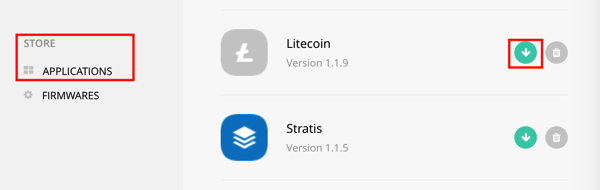 4. Under Store section under Application find LiteCoin app and press greem button to install on HW.