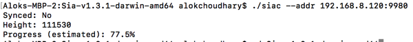 checking the status of sia host (Below output this blockchain was being synched) [shell] AC-MBP-2:Sia-v1.3.1-darwin-amd64 test$ ./siac —addr 192.168.8.120:9980 Synced: No Height: 111530 Progress (estimated): 77.5% [/shell]