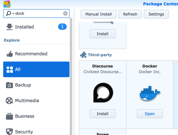 Very first step is to getting docker installed to your Synology NAS. Open package manager and search for docker. Click install.